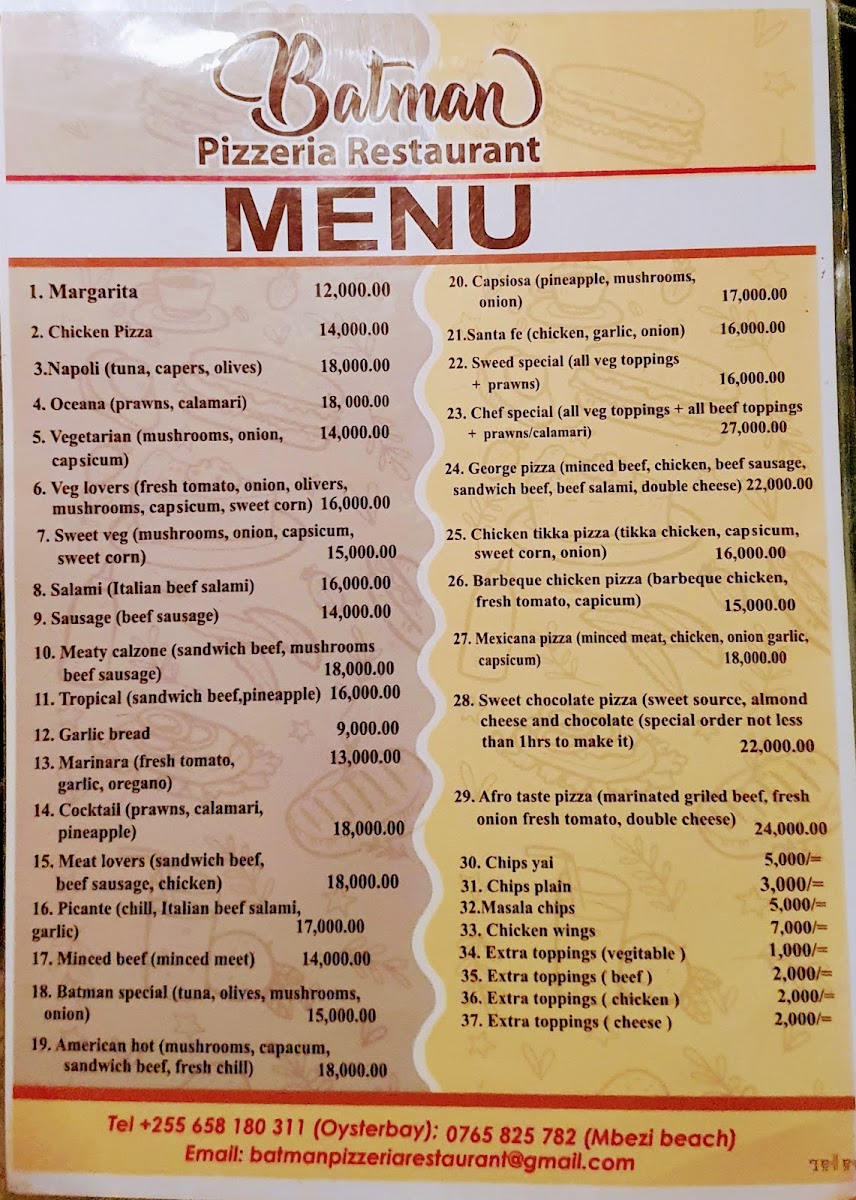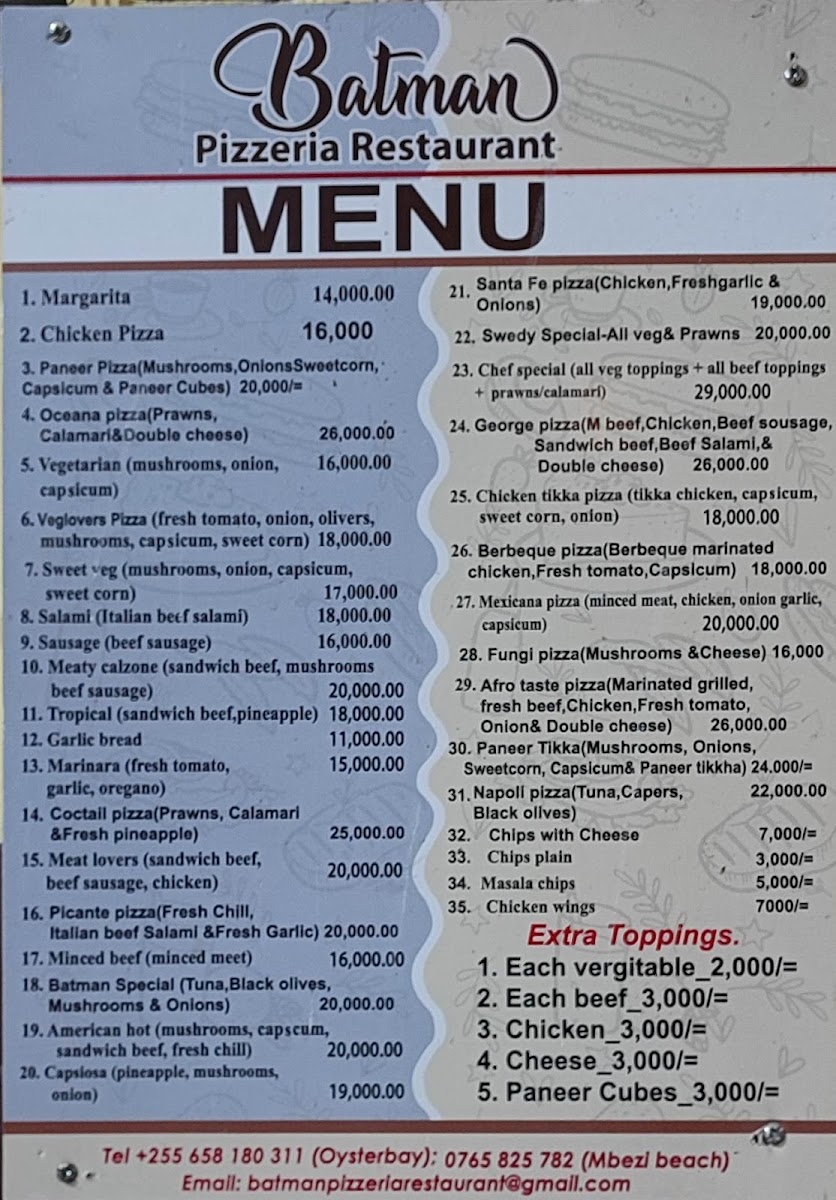 For more information or to place an order, call them at +255 752 909 224. Experience the excitement of Batman Pizzeria and indulge in a slice of culinary joy today!